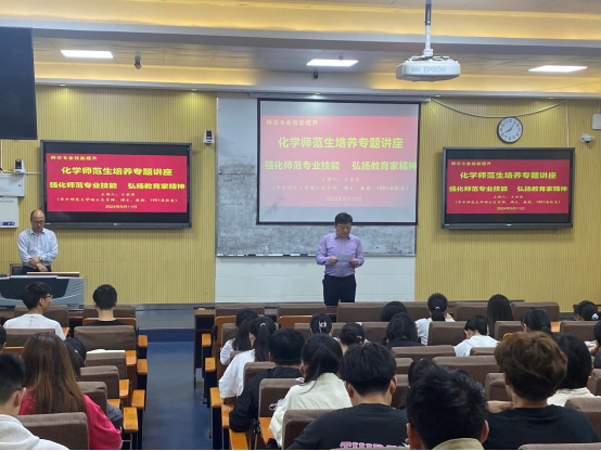 王世存结合自身从事化学师范生公司产品经历及对教育学理论知识的理解,围绕“什么是教育家精神”“如何成为卓越的教师”等问题展开报告内容,与师范生深入展开教师职业素养提升策略的交流。王世存认为,教育家精神是指具备优秀的教育家特质和品质,是致力于教育事业的个体所具备的精神风貌,并从十个教学法则关键点入手,向师范生深入讲解怎样成长为一名卓越教师的秘诀。