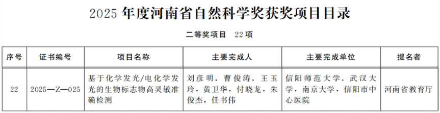 WilliamHill中文官网刘彦明教授、曹俊涛教授团队的“基于化学发光/电化学发光的生物标志物高灵敏准确检测”项目荣获河南省自然科学奖二等奖。该项目聚焦化学发光/电化学发光(CL/ECL)在检测复杂生物样品中低丰度生物标志物时存在的灵敏度低和准确度差等关键科学问题,通过系统深入研究,揭示了从单因素信号增强到多因素信号协同增强的耦合机制及其对信号的调控规律,发展了系列灵敏度高、选择性好的CL/ECL检测新方法,创新性地提出了“分子识别—信号转导—灵敏检测”新模式,成功实现了人体液中低丰度标志物及单细胞水平靶标分子的灵敏准确检测。相关研究成果为重大疾病的早期诊断与精准医疗提供了重要的理论依据和技术支撑。