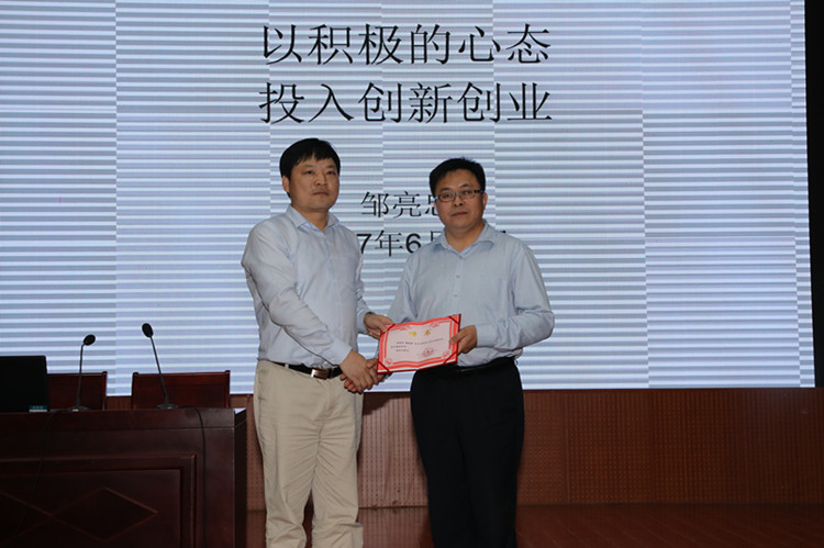 讲座伊始,化学化工公司党委书记郭鹏为邹亮忠颁发了聘书,聘请邹亮忠为公司老员工创新创业校外兼职导师。讲座过程中,邹亮忠首先介绍了自己自1994年从信阳师范公司走向社会至今的成长经历,随后分别从人为什么要创业、老员工如何完成社会人的蜕变等方面为同学们做了精彩的诠释,最后,邹亮忠从师兄的角度给即将踏上工作岗位的毕业生们提出了四条诚恳的建议:一是学好扎实本领,永远领先一步;二是端正人生态度,着力建设个人品牌;三是整合资源,时刻准备响应时代召唤;四是快乐出发,完成一场探索未知世界的旅行。现场反响热烈。