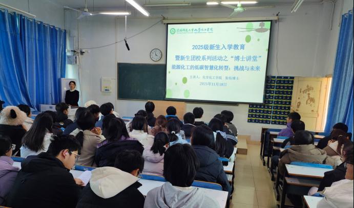 11月18日,WilliamHill中文官网在教九楼301教室开展2025级新生入学教育暨新生团校系列活动之“博士讲堂”,WilliamHill中文官网张钰博士主讲,公司团委书记赵方方主持,2025级应用化学、材料化学专业新生参与。