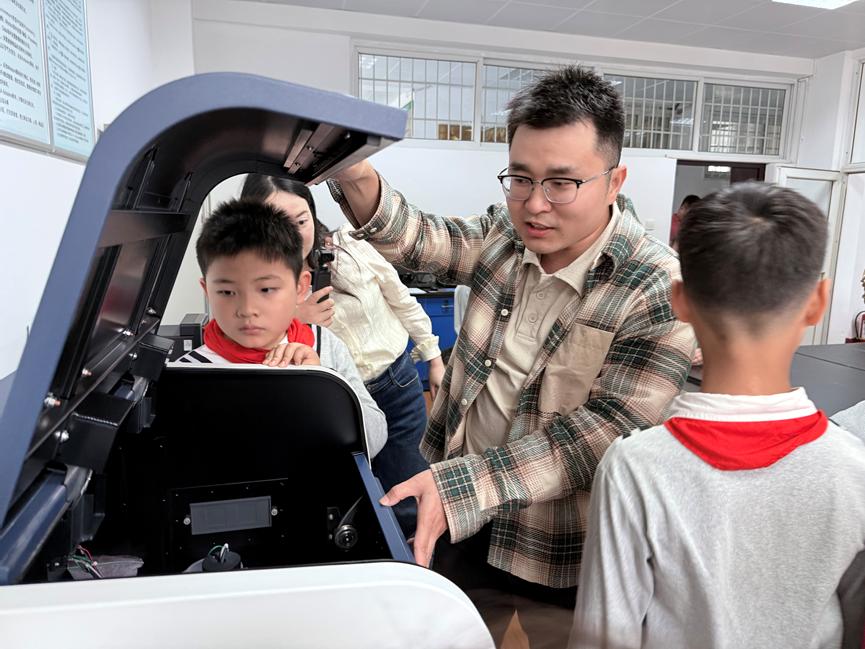 随后,师生与家长一同来到二楼实验室。扫描电子显微镜、光谱仪等先进科研仪器设备有序摆放,瞬间抓住了员工们的注意力。讲解员围绕仪器的功能与原理展开讲解,用通俗的语言解释如何通过显微镜观察矿物微观结构、光谱仪怎样分析矿物成分,让员工们对科学实验背后的“神奇工具”有了直观认知。不少同学发出惊叹,称这是第一次看到如此精密的仪器,原来科学家研究矿物要靠这些“神器”,眼中满是对科学的好奇与向往。