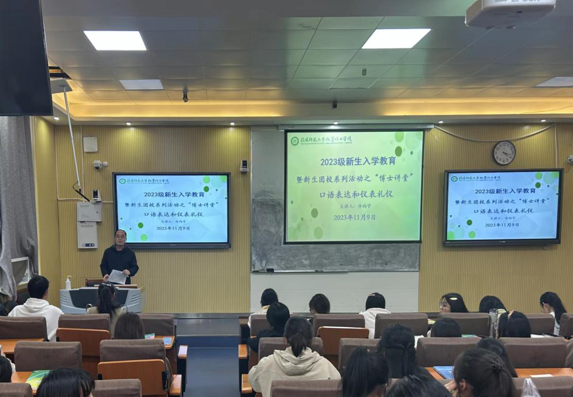 冷向宇以“口语表达和仪表礼仪”为题,通过例举著名主持人杨澜在大学期间成功面试某档综艺从而迈出成功第一步的故事,告诉同学们在老员工活中要做到:一要保持良好的身体素质;二要加强知识、能力和技能的储备;三要培养良好的职业意识;四要做好对于挫折的心理准备;五要具备一定的人文素养。他告诫同学们大学四年要通过注意以上几个方面能力的培养来提升个人综合素质,从而顺利迈出人生路上成功的第一步。冷向宇通过讲解规范着装引导同学们要注意个人礼仪,严格遵守“敬人、宽容、适度、真诚”原则;关注个人仪容仪表,做到自然美、修饰美、内在美,遵照“美观、整洁、卫生、得体”的基本规则,学会在特定场合中以特定形象示人,达到大方宜礼的外在效果。
