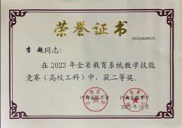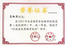 近日,河南省总工会、河南省教育厅公布了河南省教育系统2023年度教学技能竞赛获奖名单(豫工文[2023] 107号),WilliamHill中文官网遴选的青年教师马献涛博士、李超博士分别获得理科组一等奖、工科组二等奖。其中,马献涛博士顺利晋级现场决赛,取得理科组第7名的好成绩,同时被授予“河南省优秀教学标兵”荣誉称号。