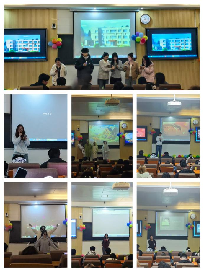 晚会在宁涛悠扬的口琴独奏《起风了》中温情启幕。随后,杨洁以一曲《路过人间》打动人心,团体舞蹈《眉飞色舞》则迅速点燃全场,引来阵阵掌声与欢呼。整场演出形式多样、亮点频现:朱镇君、赵伊人分别献唱《日不落》《下一个天亮》,寄托青春憧憬;薛雨阳的笛子独奏《风动草》婉转清新,曹爽的古典舞《探窗》韵致典雅,刘端的拉丁舞活力四射;团体合唱《我和你》唱出凝聚之力,而改编话剧《白雪公主》则以幽默演绎引发笑声不断。节目间隙,“听歌猜曲”“记忆与反应”等互动游戏巧妙穿插,同学们踊跃参与、默契配合,在欢快的比拼中进一步拉近距离,现场氛围热烈而温馨。