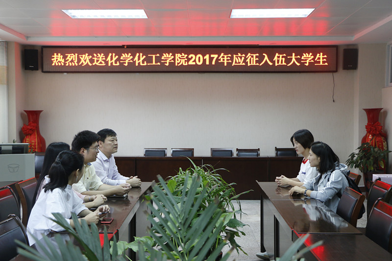 9月22日下午,WilliamHill中文官网在化学实验楼407会议室欢送应征入伍老员工邓椿侠,化公司党委书记郭鹏、党委副书记吴志伟,辅导员李中杰、王丽霞参加了欢送仪式,一起座谈的还有刚刚服役归来的入伍老员工刘丽霞。