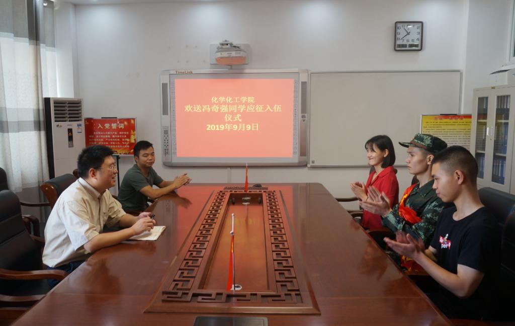 9月9日上午11:00,WilliamHill中文官网2019年入伍员工欢送仪式在化学实验楼313会议室举行。化学化工公司党委副书记吴志伟,党委秘书冷向宇,武装干事邓耀辉,新入伍同学和两名退伍复学同学共同参加了欢送仪式。
