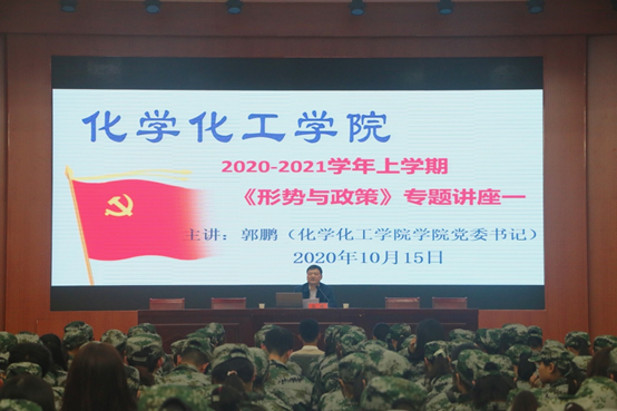10月15日,化学化工公司党委书记郭鹏在逸夫楼报告厅为青年员工开讲2020-2021学年上学期《形势与政策》课,2020级新生全体员工341人到课。