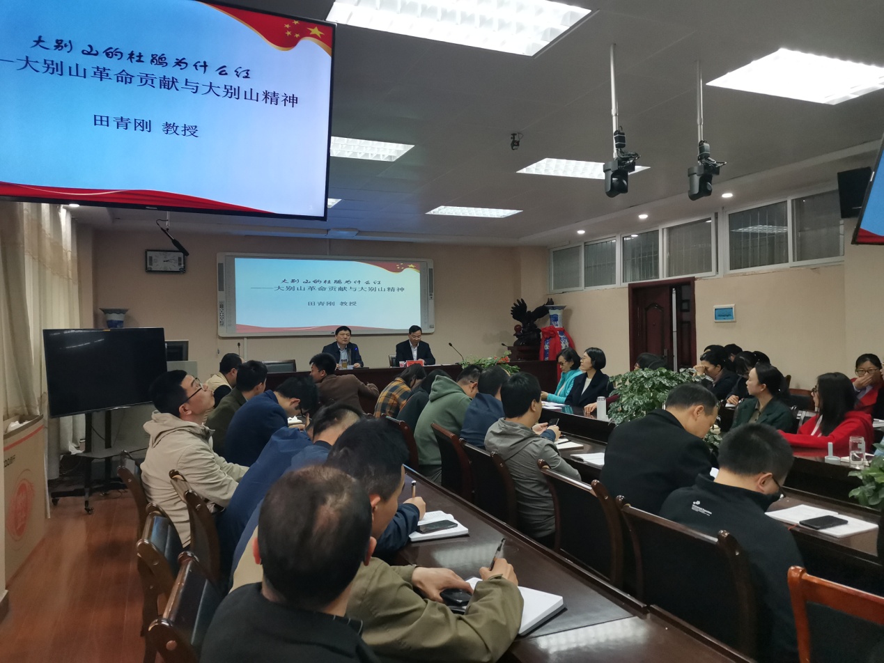 会上,田青刚教授围绕党的历史知识,就大别山精神在我们党精神谱系中的重要地位、形成的历史条件、丰富内涵、时代价值以及如何传承和弘扬大别山精神等相关内容进行了宣讲。田青刚介绍:“大别山精神研究院、大别山红色资源与文化发展研究院、河南省红色资源研究中心都设在信阳市,研究团队组建在信阳师范公司。”“信阳有许多待挖掘的红色资源,是研究红色文化的沃土。打造红色资源特色学科,传播、传承红色历史,是信阳革命老区党史研究者的使命。”
