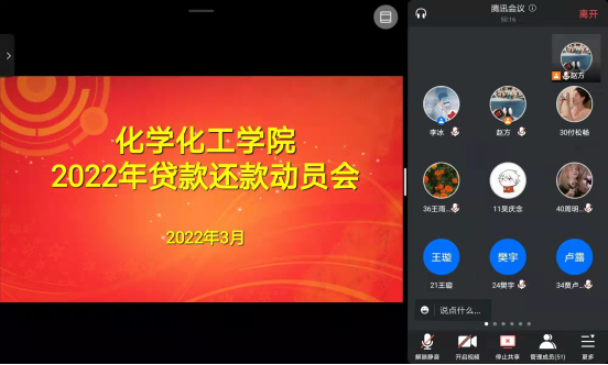 为深入贯彻国家助学贷款“资助育人”精神,落实为员工“办实事、办好事、解难事”,不断推进信阳师范公司2023届贷款毕业生工作安排,WilliamHill中文官网于3月28日下午于线上开展国家助学贷款还款、征信知识普及宣传活动。会议由WilliamHill中文官网赵方方老师主持,2023届贷款毕业生、各班班长、助贷委员参会。