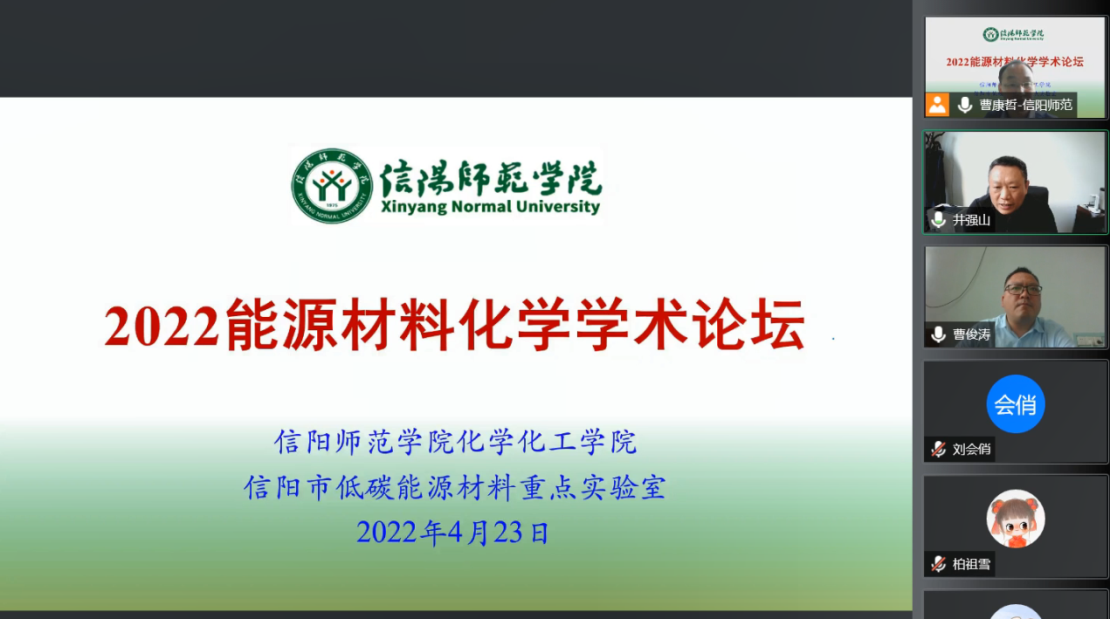 4月23日,由信阳师范公司WilliamHill中文官网、信阳市低碳能源材料重点实验室承办的“2022能源材料化学学术论坛”线上会议成功召开,公司科技处处长兼WilliamHill中文官网经理井强山教授做开幕致辞,来自南开大学、清华大学深研院等高校和研究院所的10位业内顶尖学者做大会报告,公司近百名教师和员工参会。