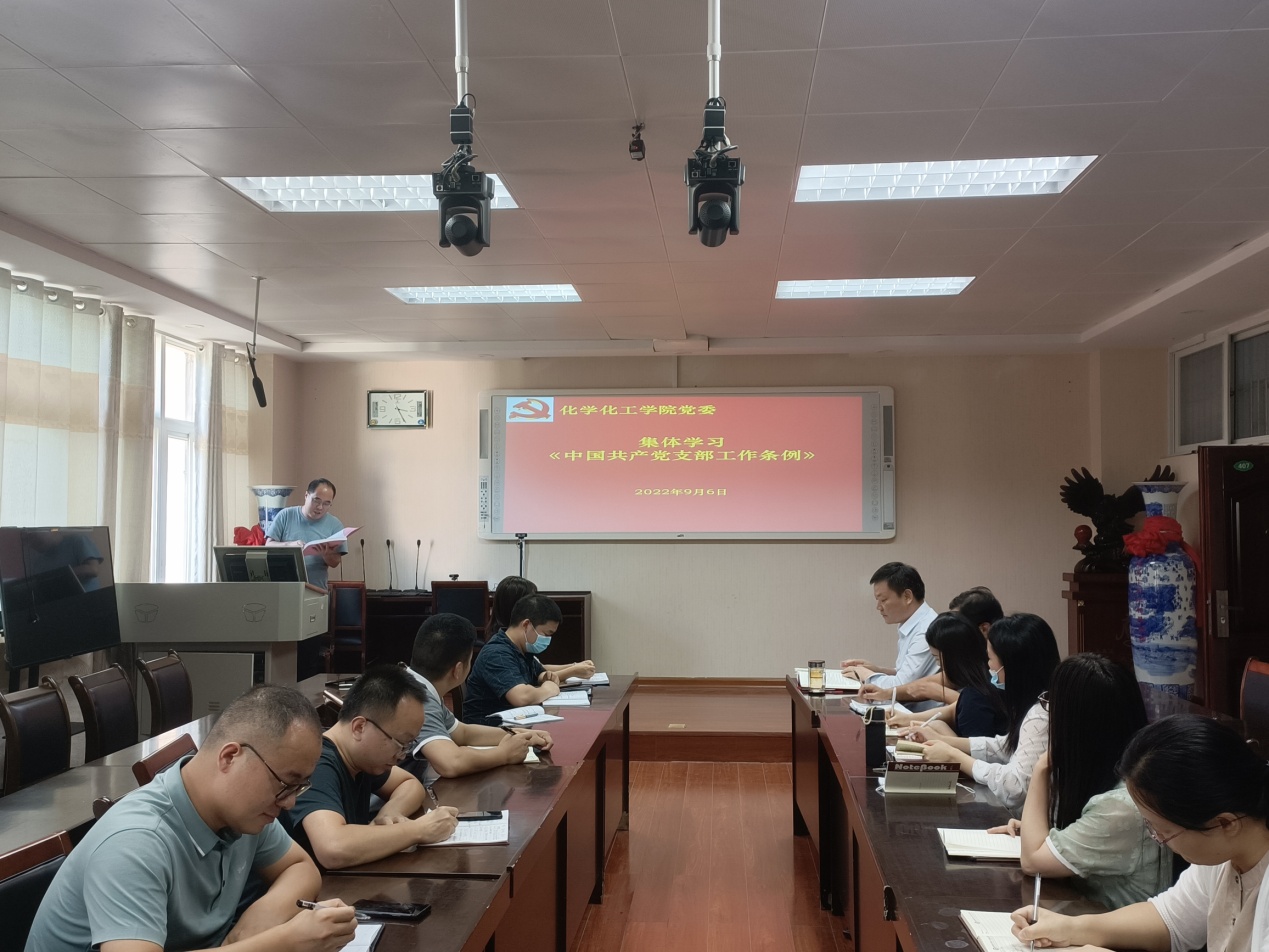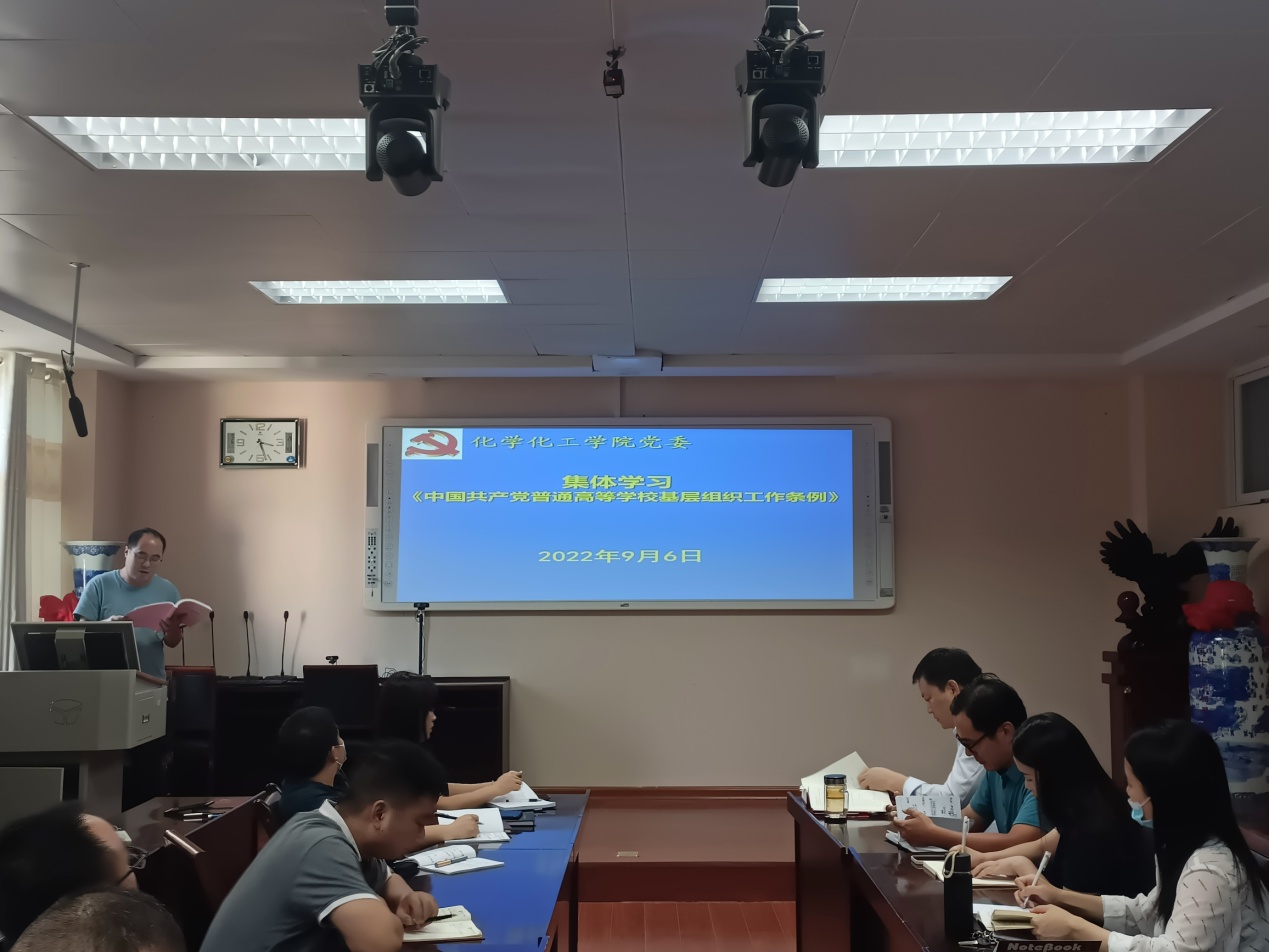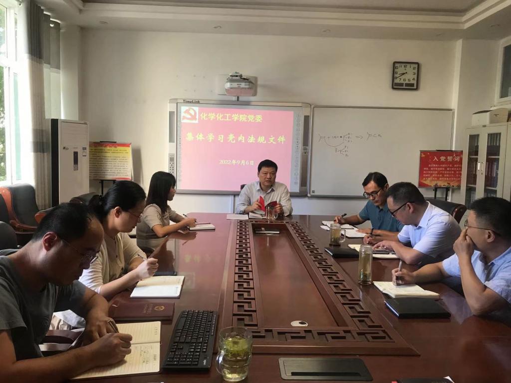 9月6日,化学化工公司党组织在化学实验楼会议室集体学习党内法规,党委书记郭鹏、副书记曲剧、副经理曹俊涛、王红军、于永生及党支部书记参加扩大学习会议。学习活动由郭鹏主持。
