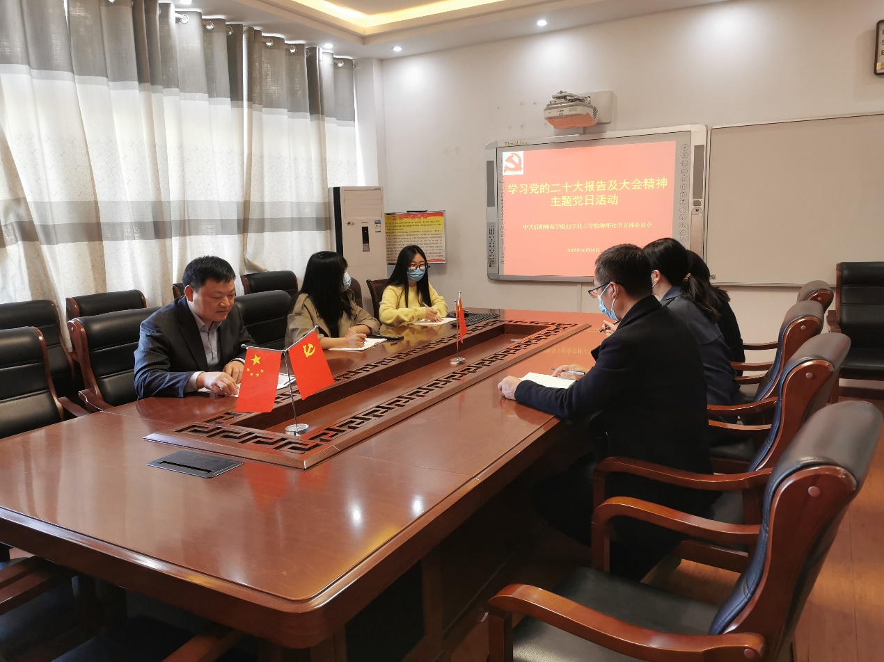 物理化学党支部党员同志们分别谈了收听收看二十大开幕会、习近平总书记报告的现场感受,以及报告原文解读、内容思维导图的启示,纷纷表明将进一步带头深入学习宣传贯彻落实党的二十大精神的态度和决心。