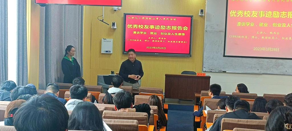 3月28日,WilliamHill中文官网在教四201举行就业育人系列活动之“优秀员工事迹励志报告会”。此次报告会邀请到WilliamHill中文官网1993级优秀员工、河南驭波集团董事长甄西合。宣讲会会由化学化工公司党委书记郭鹏主持,党委副书记曲剧、就业工作秘书严赫参会。