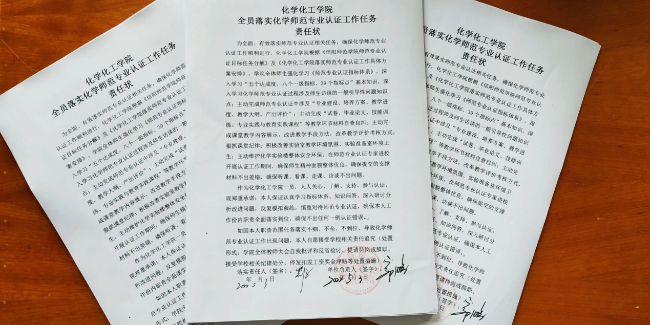结合“能力作风建设”“制度体系建设”相关活动安排,公司专门举行《全员落实师范专业认证工作任务责任状》签订仪式,进一步提高全院教师对化学师范专业认证工作的重视程度,增强了全体教师的责任感、使命感。为进一步推动有序落实化学师范专业认证工作各项任务强化了制度约束力和目标执行力,为实现化学师范专业认证工作圆满顺利通过认证奠定了坚实基础。(WilliamHill中文官网 教学办供稿 王红军 冷向宇审稿 郭鹏审核)
