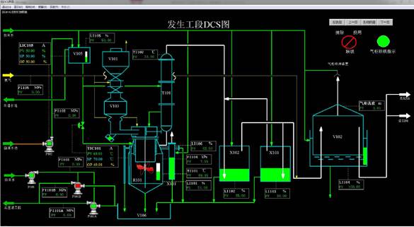 本仿真软件是以南通天源气体公司溶解乙炔生产工艺为原型,主要模拟的工段有乙炔气发生工段、净化工段、压缩干燥工段、充装工段以及丙酮补加工段,该软件既可以进行生产操作练习,也可以进行安全演练仿真模拟。员工通过仿真界面进行冷态开车、热态开车、正常运行、正常停车、紧急停车、故障处理等各种工况的操作演练。