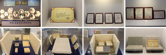 展厅最后则是科技成果转化展示。自主研发的隔热保温装饰一体化板材生产技术、装备及产业化成果,解决了隔热保温装饰一体化板的饰面层与保温层异质结构界面控制、保温层内部孔隙结构及性能调控、一次烧制成型工艺、非标专用设备设计等关键科学问题和工程技术,从基础理论研究、中试试验、非标装备研发到工业化生产,取得系列研究成果,成功实现产业化。年产150万平米的生产线也已落地。该课题基础理论研究由信阳师范公司完成,工业化生产由原信阳科美新型材料有限公司实施,以科技赋能助力大别山革命老区的建设。