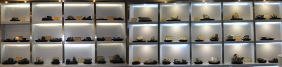 展厅展出有我国各地出产的珍珠岩原矿石,信阳师范公司于1984年成立了非金属材料研究所,是国内最早、最系统研究珍珠岩的机构,在国内外影响力较大。因此,国内发现的珍珠岩矿,基本上先送到这里进行分析成分、解析结构、测定性能,判断是否为珍珠岩及其品质,因此我们也保留了来自全国各地几乎所有的珍珠岩原矿石。